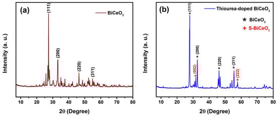 The X-ray diffraction patterns (XRD) of BiCeO3 and thiourea-doped BiCeO3 are shown in Figure 2a and Figure 2b, respectively. The results are consistent with previously reported literature for the characteristic diffraction peaks and crystallographic planes of pure BC material, along with the appearance of additional peaks at (002) and (222) in the BCT diffractogram, which are attributed to the crystalline structure of sulfur-doped BC (S-BiCeO3) after the sulfidation treatment caused by the addition of thiourea in the synthesis process [22,23,24,25,26].