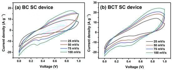 Figure 7a and Figure 7b present the cyclic voltammetry (CV) curves (Voltage, V, vs. Current density, A·g−1) of the supercapacitor (SC) devices assembled with the redox materials BC and BCT, respectively, which display quasi-rectangular shapes. These shapes indicate pseudocapacitive behavior in the SC devices. The electrochemical performance of the devices was evaluated at scan rates of 25, 50, 75 and 100 mV·s−1 over 500 cycles to 1V of potential window. As the scan rate increases, the CV curves tend to become more rectangular and exhibit greater current density amplitude. This phenomenon is attributed to a reduction of oxygen-containing functional groups at the surface of the carbonaceous material (graphene in this case) and the concomitant improvement in its electrical conductivity. At higher scan rates, the quasi-rectangular profile becomes more pronounced, resembling behavior with diminished pseudocapacitive contributions.