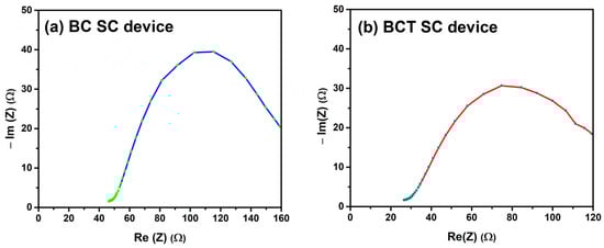 EIS curves of (a) the BC material SC device and (b) the BCT material SC device.