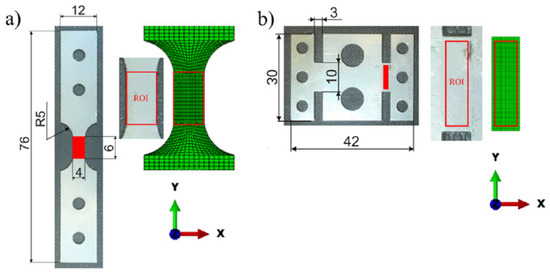 Similarly, Musiał, Nowak, and Maj [9] prepared the material applying a combination of methods by first coating the test tube with soot, then spraying it with small dots of white paint. They generated a high contrast in the specimen to perform the DIC analysis using a monochromatic camera. The tests were performed on two different types of specimens as shown in Figure 7, uniaxial tension specimens (a) and single shear specimens (b), both with a given Region Of Interest (ROI) of 6 × 4 mm and 10 × 3 mm respectively.