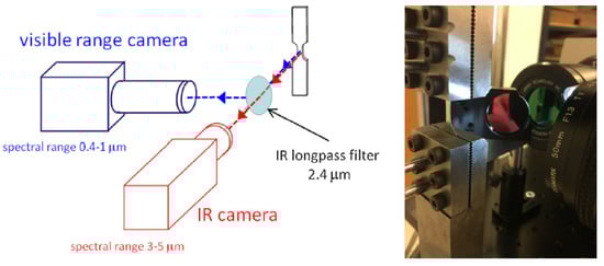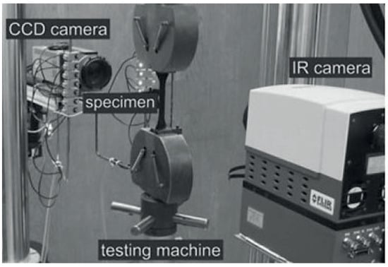 Similarly, Oliferuk et al. [2], added a Phoenix infrared camera to their equipment configuration, since they also wanted to perform a thermal analysis by DIC. To achieve this, the cameras had to be positioned facing each other, with the specimen in the middle, since the specimen has a different surface preparation depending on the type of analysis to be performed, as shown in Figure 8.