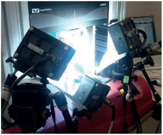 Farahani et al. [12]) applied high-resolution 3D DIC using the VIC-3D HR system, which allows the analysis of deformations and displacements in X, Y, and Z. This system includes two high-resolution charge-coupled cameras (CCD) placed in an arrangement similar to Driemeier et al. [7], but in this case, aligned in the same plane by being on the same base, as can be seen in Figure 11. The cameras also had a C-Mount Rodagon 150/5.6 lens and were placed in front of the specimen at a distance of 1 m. They also made use of an external light source, using a halogen lamp, while the specimen was tensioned by a standard MTS-812 servo-hydraulic testing machine. The software used for the DIC analysis that integrates this system is VIC-3D. To obtain better resolution of the results and avoid distortions, the system uses a calibration template consisting of a pattern of 12 × 9 points located with a separation of 2.5 mm, which is subjected to DIC analysis and then proceed to the analysis of the specimens.