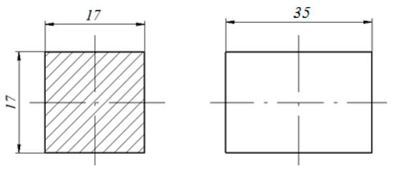 The material used in this study was an σ/β titanium Ti–5Al–3Mo–1.5V alloy. The Ti–5Al–3Mo–1.5V titanium alloy was produced in Vietnam. The test specimens were in the casting state. The rectangular specimens with a width of 17 mm, a length of 17 mm, and a height of 25 mm were used for the experiment (Figure 1). The chemical composition of the analyzed Ti–5Al–3Mo–1.5V alloy is shown in Table 1.