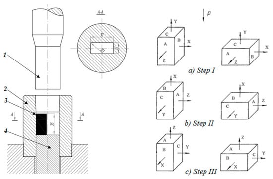 The CCDF process was performed in steps and cycles in a closed die. The deformation cycle consists of three steps, I, II, and III. The forging dies and the order of steps per cycle are shown in Figure 2. The initial workpiece’s faces were marked as A, B, and C, which correspond to the coordinate axes of X, Y, and Z.