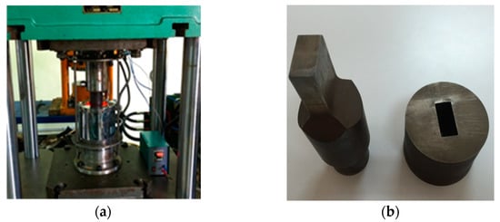 The containers with the specimens were heated to the deformation temperature (850, 900, and 950 °C) in a Nabertherm chamber furnace LH120/13, and the specimens were then placed into the working chamber of a forging die (Figure 3). The delay before beginning the extrusion was 20–30 s. The heating process for the die was done on a furnace capable of heating up to 800 °C, with a set temperature of ±3 °C.