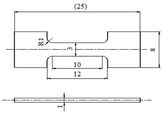 The microstructure of the deformed samples was examined using a Nova-NanoSEM-450 scanning electron microscope (SEM) and optical microscopy. A tensile test was performed on compression puller TT-HW2-1000. The tensile properties of the material deformed at deformation temperature were determined by a tensile test at room temperature. The tensile samples for the tensile test are presented in Figure 4.