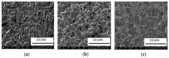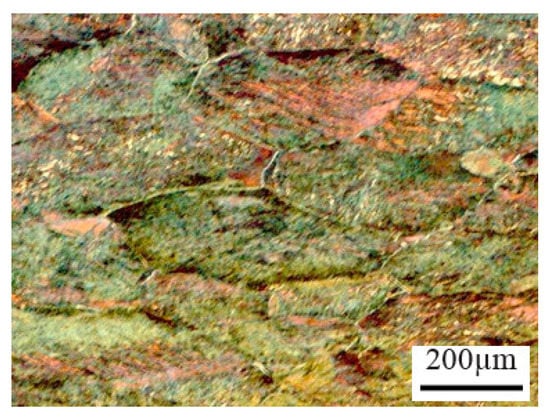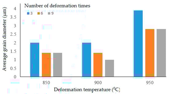 From the experimental results, it was found that after the CCDF process, Ti–5Al–3Mo–1.5V titanium alloy had a significantly improved microstructure. The average grain size decreased significantly (Figure 8). However, it was found that at the pressing temperature of 950 °C, the microscopic structure of the specimens was different because the specimens were deformed at temperatures above the Ac3 region (phase transition temperature), so the microstructure obtained was phase α’ (mactenxite), the oversaturated hexagonal α phase of molybdenum and vanadium [2]. At a deformation temperature over 900 °C, the average grain size increased with increasing temperature; the smallest average grain size was obtained in the temperature range of 870–900 °C.