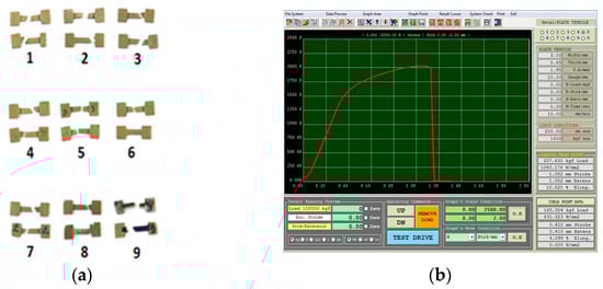The tensile results: (a) specimens after tensile tests; (b) tensile test chart after 9 deformation times at 950 °C.