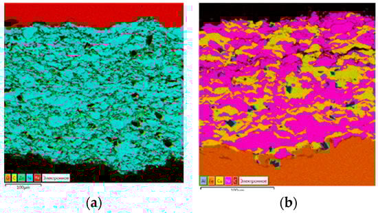 Figure 1a illustrates the structure of Ni–Zn coatings with the various ratios of elements. As is shown in the image, the coatings have an even distribution of zinc in the nickel matrix, there are some micro-discontinuities, and no cracks in the structures. Dark “islands” of Al2O3 with an average size of 2–5 microns are clearly visible in the structures. This can be seen in the shades of the spectrum (aluminum and oxygen are indicated on the energy dispersive spectrum map together), as well as by size (size of the fraction of aluminum oxide) and shape (aluminum oxide has a fragmented form; pores, on the contrary, are usually round).