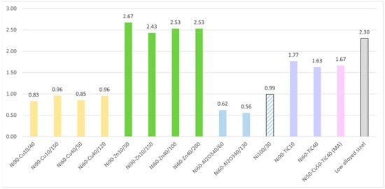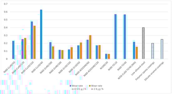 It is worth noting that according to Kovalev et al. [26], the hydroabrasive wear rates of industrially used coatings for pipelines are 0.15–0.25 g/h on average for coatings on a polymer epoxy base and 0.4–0.5 g/h for coatings on a silicate–enamel base, while low-alloyed steel pipelines without any coatings have a wear rate of 0.4 g/h. Thus, the results of tests for resistance to hydroabrasive wear show that nickel-based coatings are more resistant than industrially used, non-metallic coatings.