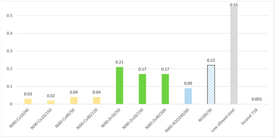 For comparison, the corrosion rate values for low-alloy steel and Inconel 718 nickel-based alloy are given in Figure 4. It can be seen that Ni–Cu samples have an order of magnitude higher corrosion rate compared to Inconel 718. It can also be seen that, compared with a low-alloy steel, the studied nickel-based coatings provide significant corrosion protection: the corrosion rates with the coatings are 3 to 10 times lower.