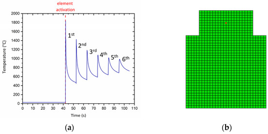 Figure 1a shows the temperature “history” of a selected material point. The solid part and substrate geometry employed in the thermal analysis and the selected material point, denoted by a red dot, are depicted in Figure 1b. The history of the temperature field computed in the thermal analysis will be used to determine the microstructural evolution in the processed part.