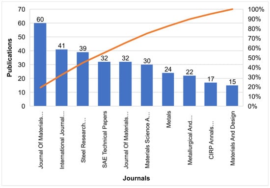 Figure 3 shows the top 10 productive journals regarding hot stamping technology. Analyzing these results with those related to number of citations per author, it can be concluded that the Journal of Materials Processing Technology is, obviously, the reference journal for hot stamping technology with 57 articles in the last decade that have been cited 3095 times. It is also remarkable the contribution of CIRP Annals—Manufacturing Technology with only 13 publications but 1359 citations. This fact also makes this journal a reference in this field.