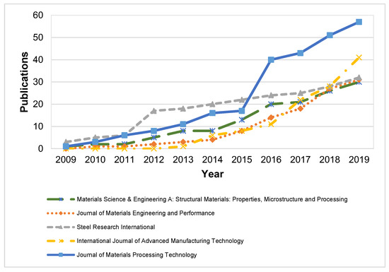 Figure 4 shows the number of publications per year just for the top five journals. It is remarkable the evolution of the International Journal of Advanced Manufacturing Technology, one of the latest to join.