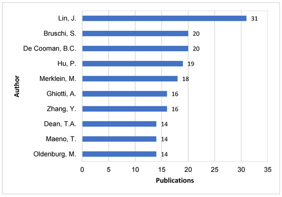 Figure 5 shows the top 10 authors with publications related to the hot stamping area. The most productive researcher is J. Lin, with 31 publications. This data coincides with the Figure 11 statistic, scientific production per country, where China is the most productive country. Top production researchers, such as Merklein, Bruschi, and Ghiotti, are also the authors of the most relevant reviews in the field [2], which indicates that, in hot stamping, most productive authors are also the scientific references.