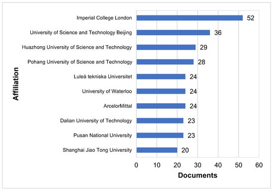 Figure 6 shows the top 10 institutions with the largest number of published works in the field. The Chinese institutions are, of course, the most productive organizations considering that China is the most productive country as shown below.