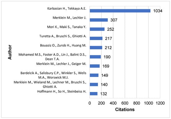 Figure 9 shows the 10 most influential authors who have had the most impact on this topic. H. Karbasian and A.E. Tekkaya [4] are the most cited authors with their review in 2010, followed by M. Merklein and J. Lechler [9] with another review in 2016. Other relevant authors, such as A. Ghiotti and S. Bruschi, were also among the highest production authors.