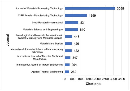 Figure 10 shows the number of citations per journal, the Journal of Materials Processing Technology and CIRP Annals—Manufacturing Technology being the most influential in terms of the scientific dissemination of this topic. This observation fits with the list of most prolific journals, meaning that productivity and quality, measured as citations, are related in hot stamping literature.