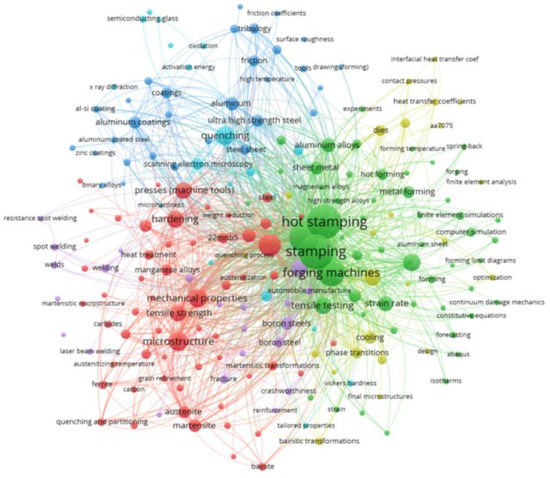 Figure 12 shows a network visualization of the author keywords to establish the most relevant of them. There is a total of 207 items grouped in six different clusters. The most relevant keywords can be found in the green cluster with keywords such as hot stamping, stamping, forging machines, etc. It is also relevant to the red cluster with terms such as microstructure, mechanical properties, high strength steel, hardening, etc.