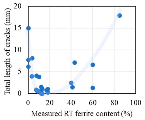 Total length of cracks vs. δ-ferrite content measured at room temperature for 24 austenitic and austenitic-ferritic welds in [4].
