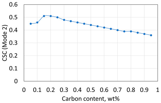 Cracking susceptibility coefficient (CSC, under mode 2 cooling condition) vs. carbon content for Fe-0.5Si-xC (x = 0.05~0.95, in wt.%) ternary system.