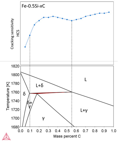 To address the disparity, a metric named HCS (hot cracking susceptibility) [9] is used to represent the cracking sensitivity. Figure 3 shows the plot of HCS values against varied carbon content in the Fe-0.5Si-xC ternary system in comparison with an isopleth of the equilibrium phase diagram. The tendency of the HCS curve matches well with the experimentally-determined cracking percentage curve in [8], with a dip at an intermediate carbon level indicating a less cracking-sensitive composition. Compared with the phase diagram in Figure 3b, the first bump of the curve corresponds to the alloy compositions with a peritectic reaction (L + δ → γ) occurring during solidification. This indicates that the hot cracking sensitivity is a combined effect of solidification temperature and solidification range. With peritectic reactions, the solidification range is expanded and therefore increases the susceptibility to hot cracking. Therefore, compared with the CSC curves, the HCS is a more comprehensive metric that can better represent the cracking sensitivity during solidification.