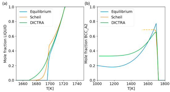 Comparison of cooling simulations under equilibrium condition, and under non-equilibrium conditions performed by Scheil and DICTRA. (a) Comparison of fraction of liquid during solidification; (b) comparison of δ-ferrite fraction during continuous cooling.
