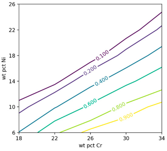 As described in previous sections, the HCS and the fraction of δ-ferrite are composition-dependent metrics to evaluate the solidification cracking susceptibility of alloys. Therefore, they can be adopted in compositional designs for improved cracking resistance based on selected benchmark materials. Figure 6 exemplifies a simple ICME-predicted “Schaeffler diagram” generated with δ-ferrite fraction data points obtained from DICTRA simulations. For an identified δ-ferrite fraction, the composition can be adjusted based on sensitivity, with constraints from the HCS values.