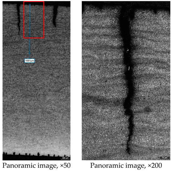 For metallographic studies, longitudinal thin sections (along the dashed line in Figure 3) were cut out from the samples after testing on the SSC so that the fracture surface fell into the thin section. A panoramic view of the structure of the reverse part of the sample is shown in Figure 4.