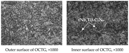 The structure of OCTG samples is composed of tempered martensite and sorbite (Figure 5a). An inhomogeneity was also found along the pipe wall thickness in the form of segregation bands located at the inner surface and occupying about a third of the thickness (Figure 5b).