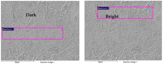 The structure in the segregation bands is more dispersed and contains many small non-metallic inclusions. According to the results of the chemical analysis of the dark and light bands presented in Table 2 and Figure 7, it was determined that in the segregation areas there is an increased content of molybdenum, chromium, and silicon, inherited from the zonal segregations in the central part of the continuous casting.