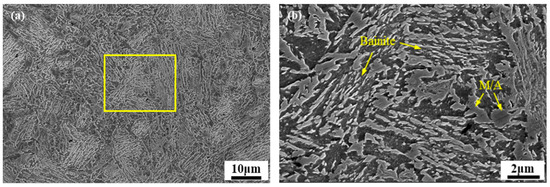 Figure 1. (a) SEM micrographs of the hot-rolled sample; (b) enlarged image of the yellow square in (a).