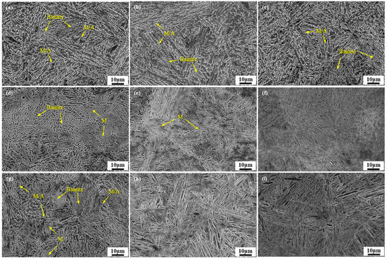 Figure 2. SEM micrographs of different initial microstructures obtained by different austenitizing process. (a) 680 °C/1 h/ air cooling (AC); (b) 680 °C /1 h/oil quenching (OQ); (c) 680 °C/1 h/ water quenching (WQ); (d) 850 °C/1 h/AC; (e) 850 °C/1 h/OQ; (f) 850 °C/1 h/WQ; (g) 1000 °C/1 h/AC; (h) 1000 °C/1 h/OQ; (i) 1000 °C/1 h/WQ.