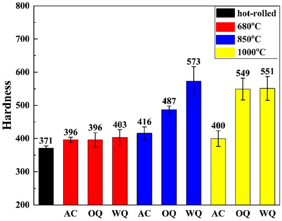 The Brinell hardness testing was performed on different initial microstructures, and the results were shown in Figure 3. For comparison, the Brinell hardness of the as-received hot-rolled steel was also listed. It can be seen that the Brinell hardness of the 1000 °C/water quenching (WQ), 1000 °C/oil quenching (OQ), and 850 °C/air cooling (AC) samples are higher than 500 HBW, typical hardness of martensite. The hardness of 850 °C/OQ is 487 HBW, which lies between the hardness of bainite and martensite. The hardness of the other specimens is close to 400 HBW, which is slightly higher than the hardness of the hot-rolled sample, corresponding to the bainite structure.
