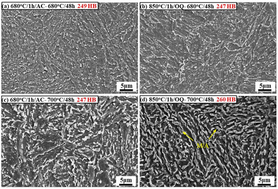 Figure 4. Microstructure of sample austenitized and then annealing: (a) 680 °C/1 h/AC-680 °C/48 h, (b) 850 °C/1 h/AC-680 °C/48 h, (c) 680 °C/1 h/AC-700 °C/48 h, (d) 850 °C/1 h/AC-680 °C/48 h.
