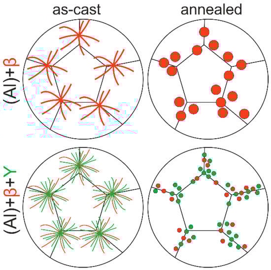- Zn and Mg must provide a more than sufficient hardening after solid solution treatment and ageing. With regards to further practical applications, their amount (8 wt.% and 3 wt.%) was chosen from concentrations in the established ultra-high-strength 7085 alloy and our previous studies. For example, the latter showed that excessive Zn (>10 wt.%) may bring a lowering of equilibrium solidus and further grain-boundary melting after homogenizing annealing at 500 °C. Additionally, several works [22,23,24] have revealed that an increase in Zn content over 9 wt.% causes a decrease in ductility, rather than an increase in strength. When considering Mg, the content chosen was the maximum for commercial alloys [25]. An increase in Mg is practically used for increasing hot tearing resistance, while the toughness, essential for wrought alloys, may be tuned by lowering the Mg:Zn ratio. In addition, as is shown in Figure 2a both Zn and Mg remarkably narrow the area of (Al) solidification. However, Zn acts in a slightly stronger manner and may bring some risks regarding an unacceptable primary solidification of intermetallics.