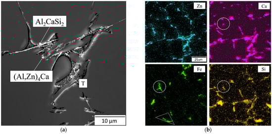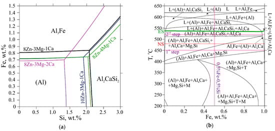 - Ca provides the formation of the eutectic-origin phases, which may also include Fe and Si (Al10CaFe2, Al2CaSi2). An increase in the Ca content may bring far more benefits in improving density, corrosion resistance, and casting properties. However, to the best of our knowledge, the Ca content must be controlled down to 2 wt.% due to limitations in industrial emission spectrometry for chemical analysis. Besides, the higher the Ca, the lower the Zn in (Al), due to the incrementing (Al, Zn)4Ca phase, bringing a loss of strength. In addition to the primary solidification, an increase in Ca from 1 wt.% to 2 wt% shifts the equilibrium line Al3Fe/(Al) by 0.12 wt.%. Hence, further Ca alloying may bring Fe-bearing primary phase at a given Fe and Si content.
