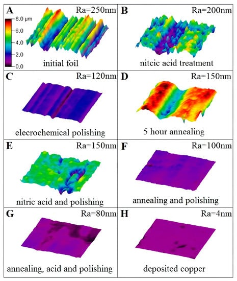 The initial copper foil has the arithmetic average roughness Ra about 250 nm (Figure 1A). The treatment of sample in nitric acid leads to Ra about 200 nm (Figure 1B), while ECP can provide Ra = 120 nm of the foil (Figure 1C). The annealing process results in the same Ra = 150 nm of copper foil as the combination of nitric acid treatment with further ECP, see Figure 1D,E, respectively. The combination of annealing and further polishing, as well as annealing and further acid treatment and ECP results in the roughness of 100 and 80 nm and is presented in Figure 1F,G, respectively. For comparison, the morphology of thin copper film (Ra = 4 nm) deposited on an optically flat single-crystal sapphire substrate is shown in Figure 1H.