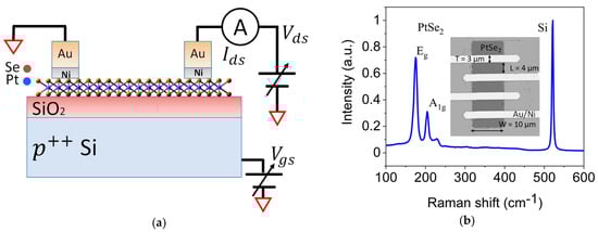 film, obtained by direct selenization of 0.7 nm thick Pt film (fabrication details in ref. []), is transferred on /p-Si substrate and it is etched by SF6-based inductively coupled plasma process. The patterned (6 layers thick) is then contacted by Ni(20 nm)/Au(150 nm) metal leads. A schematic of the FET is shown in Figure 1a.