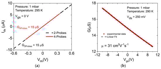 We initially applied two- and a four-probe configuration to measure the channel characteristics. Figure 2a shows that the two techniques yield the same result, indicating that the device has good ohmic contacts with low resistance. Therefore, we decided to use the simplest two-probe setup for further electrical characterization.