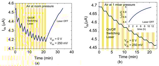 The effect of light on nanosheets was investigated by illuminating the device with a supercontinuous white laser (450–2400 nm), with light pulses of given time duration and intensity. Figure 3a,b show the device channel current under fixed bias conditions for switching light at the intensity of 30 , in air at room pressure and at 1 mbar, respectively.