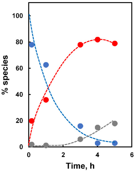 Time course of the cleavage of plasmid pBR322 by AuNP4-Zn(II). Color codes: blue, supercoiled plasmid (form I); red, nicked circular (form II); gray, linear (form III).
