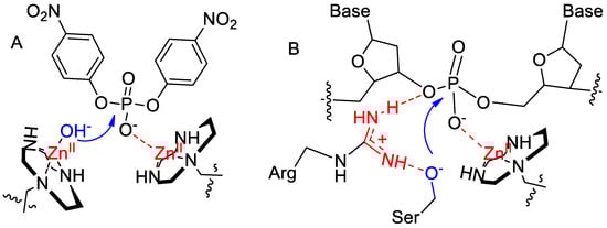 Despite being the fundament of life for living organisms, many functionalities of DNA and RNA still present as challenging targets for scientists. One such aspect is the elucidation of the complete mechanism behind the hydrolysis of the nucleic acids’ backbone, comprised of repeated phosphodiester bond segments linking adjacent nucleosides. Indeed, the phosphate bond is known for its superb stability [1], which allows RNA and DNA to remain intact at 25 °C, pH 7.0 for hundreds and millions of years, respectively. However, enzymes called nucleases perform phosphodiester cleavage in seconds, a result yet to be surpassed by artificial competitors [2].