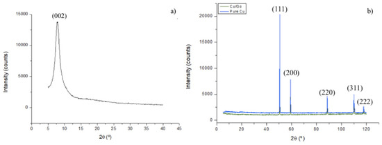 For the composite (Figure 5a), it is possible to notice that there is no change in mass; as there was no gain, it is possible to deduce that there was no oxidation; and the fact that there is no loss of weight is due to the low amount of graphene in the composite, being formed mainly of copper [30]. For GO (Figure 5b), it is possible to initially observe a loss of mass below 100 °C, of about 30%, which is associated with the elimination of adsorbed water and gas molecules. The range between 100 and 200 °C shows an abrupt loss of 34% in mass and, between 200 and 300 °C, of 13%, which are related to the elimination of functional oxygen groups. In the region of 300–600 °C, the material remains stable, showing a small loss of mass (approximately 3%), followed by a last loss in the region of 600–800 °C, related to the removal of functional oxygen groups being even more stable [25,26].