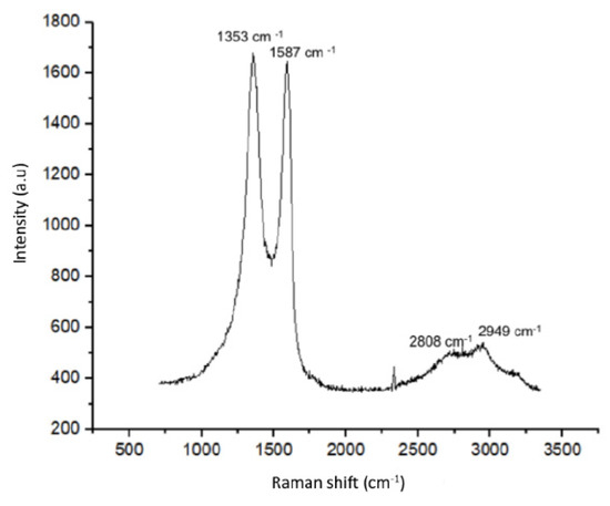 The Raman spectra of graphene normally shows peaks referring to the D (~1350 cm−1) and G (~1580 cm−1) bands. In this study, bands D (1353 cm−1) and G (1587 cm−1) with Raman displacement, similar to those found in the works of Faria et al. [20], Yue et al. [22], and Gao et al. [23], were found. The relationship between the intensities of bands D and G allows to obtain the amount of defects present in the carbon structure. The ID/IG ratio for GO is greater than that of graphene and reduced graphene oxide, and this is owing to the presence of oxygenated functional groups linked to the carbon structure [15]. The ratio of the intensities of bands D and G used in this study was approximately 1.0. In addition to the bands D and G, it was possible to observe the presence of the peaks referring to the bands 2D (2808 cm−1) and 2D’ (2949 cm−1). These bands appear with less intensity in relation to the D and G bands and are related to the stacking of a number of carbon layers of the graphene structure [24]. Thus, the presence of these bands shows that the oxide analyzed is formed by stacking layers and not just monolayers, which can be confirmed by the X-ray diffraction analysis presented in Figure 2a.