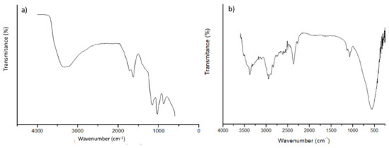 Fourier transform infrared spectroscopy (FTIR) was obtained at the Instrumental Support Laboratory (LAPIN1) of the Institute of Macromolecules Professora Eloisa Mano (IMA-UFRJ). The analysis of the spectrum obtained for GO (Figure 4a) allows us to initially observe the occurrence of a broadband between 3000 to 3700 cm−1, which is related to the existence of water adsorbed between the leaves and a peak at 3347 cm−1, which can be attributed to the OH stretching range. At 1626 cm−1, another peak is identified, corresponding to the stretching vibrations of C=O, followed by a third peak at 1158 cm−1, referring to vibrations of C-O-C epoxy groups; at 1036 cm−1, vibrations of C-OH bonds and, finally, a last peak at 873 cm−1 due to the stretching vibrations of epoxy groups [25,26,27]. For composite Cu/GO, presented in Figure 4b, some characteristic peaks can be observed relative to the GO, presented in Figure 4a, such as the existence of a band present at approximately 3500 cm−1, related to the O-H elongation vibration. The absorption bands observed at 2954 cm−1 can correspond to symmetric vibration of C-H bond. At 1060 cm−1, a band related to C-O elongation (epoxy/ether) is noted. A peak appeared at 596 cm−1, which is attributed to observation of hydroxyl deformation modes [15,28,29].