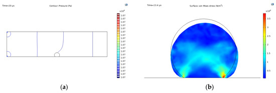 Fluid-structure interaction simulation results: (a) pressure contour; (b) Max. von Mises stress, t = 13.4 s and fraction of ligands = 0.8; (c) time-dependent velocity field given by Equation (17); (d) constant velocity field given by .