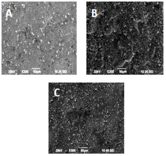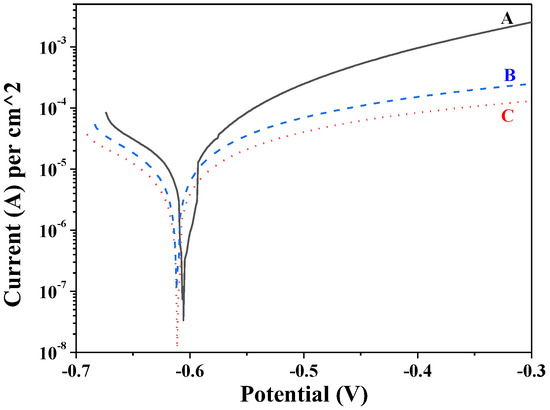 The PD curves of the multilayer structures are demonstrated in Figure 6. It is well visible that all the systems had close corrosion potentials (between −0.605 V and −0.611 V, respectively), which could be expected as a result of their nature and composition. More interesting is the anodic branch of the curves. The registered corrosion current densities of the investigated systems were as follows: for multilayer A, 8.1 × 10−6 A/cm−2; for multilayer B, 4.3 × 10−6 A/cm−2; for multilayer C, 2.3 × 10−6 A/cm−2. In addition, as a result of the applied external anodic polarization, multilayer A presented higher anodic current densities compared to B and C (up to about one order) in the whole potential area during the investigation. These observations led to the conclusion that the application of some selected polymers positively affected the corrosion resistance properties of the sol–gel coatings in that medium, ensuring their lower current densities in the anodic region.