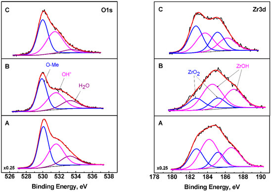 The XPS results show that peaks of C1s, O1s, Zr3d, Ti2p and Fe2p were registered on the surface. The oxygen spectra consist of three components. The first one, at 530 eV, corresponds to oxygen bound to metals, while the second and third ones, at 531.6 eV and 533.4 eV respectively, are attributed to adsorbed hydroxyl groups and surface water (Figure 4). The zirconium spectra are decomposed into several peaks associated with ZrO2 (with binding energies 182.7 eV for Zr3d5/2 peaks and 185.2 eV for Zr3d3/2 peaks) and ZrOH (with binding energies 184.0 eV for Zr3d5/2 and 186.7 eV for Zr3d3/2). 1.4 at% TiO2 and 13 at% Fe2O3 are also registered on the surface. From the areas of the deconvoluted oxygen peaks, it can be concluded that the amount of hydroxyl groups is the largest in multilayer C.