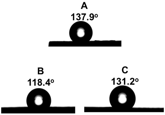 Contact angles of the multilayer structures. (A) 3 layers TiO2 (sol A) and top ZrO2 layer; (B) 3 layers TiO2 (sol B) and top ZrO2 layer; (C) 3 layers TiO2 (sol C) and top ZrO2 layer.